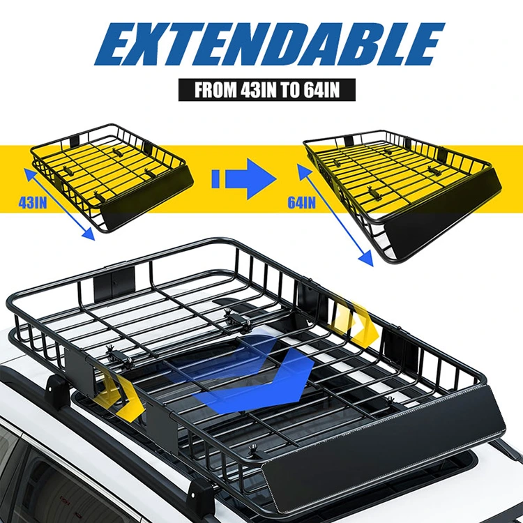 Выдвижная конструкция: эта корзина для багажника на крыше имеет продуманную выдвижную конструкцию — стандартный размер (43 x 39 x 6 дюймов) для компактных автомобилей и расширяемый до 64 дюймов для более крупных автомобилей, что позволяет максимально увеличить грузовое пространство. Его складная форма позволяет легко разбирать, транспортировать и хранить, когда он не используется. Он подходит для гибких путешествий и хранения вещей.